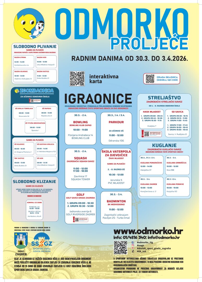 Školski sportski savez Grada Zagreba tijekom proljetnoga odmora učenika od 30. ožujka do 3. travnja 2026. godine organizira program Odmorko proljeće. Program će se provoditi radnim danima uz stručni i pedagoški nadzor.