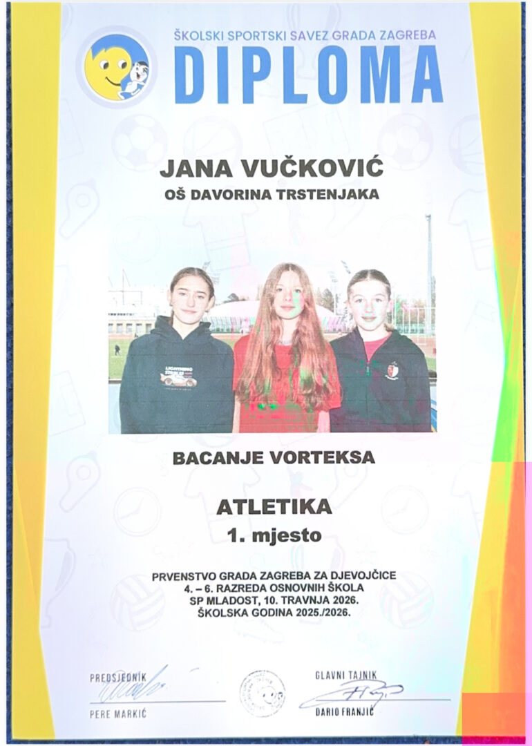 Naša učenica Jana Vučković iz 5.a razreda na Županijskom atletskom natjecanju za djevojke 4. – 6. razreda koje se održalo 10. travnja osvojila je 1. mjesto u kategoriji bacanje vorteksa za djevojčice s vrhunskim rezultatom od 52,6 metara.